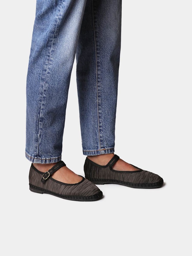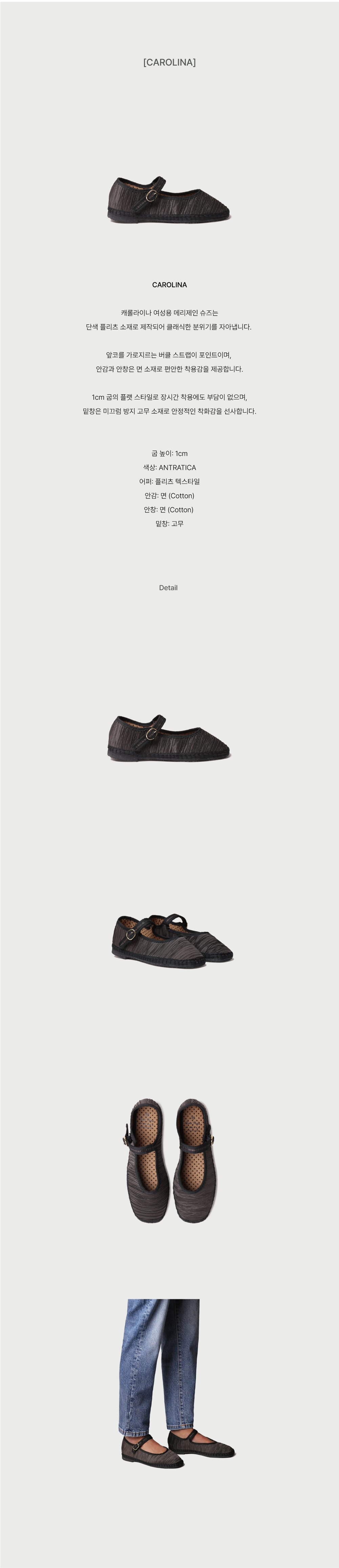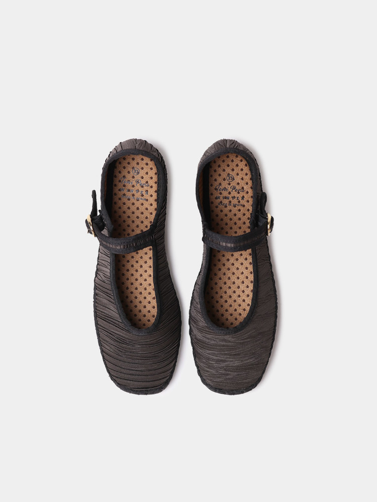 단색의 플리츠 소재로 제작되었습니다. 클래식한 메리제인 디자인에 앞코를 가로지르는 버클 스트랩이 특징입니다. 안감과 안창은 면 소재입니다. 이 플랫 스타일은 1cm 굽으로 매우 편안합니다. 밑창은 미끄럼 방지 고무 소재입니다.